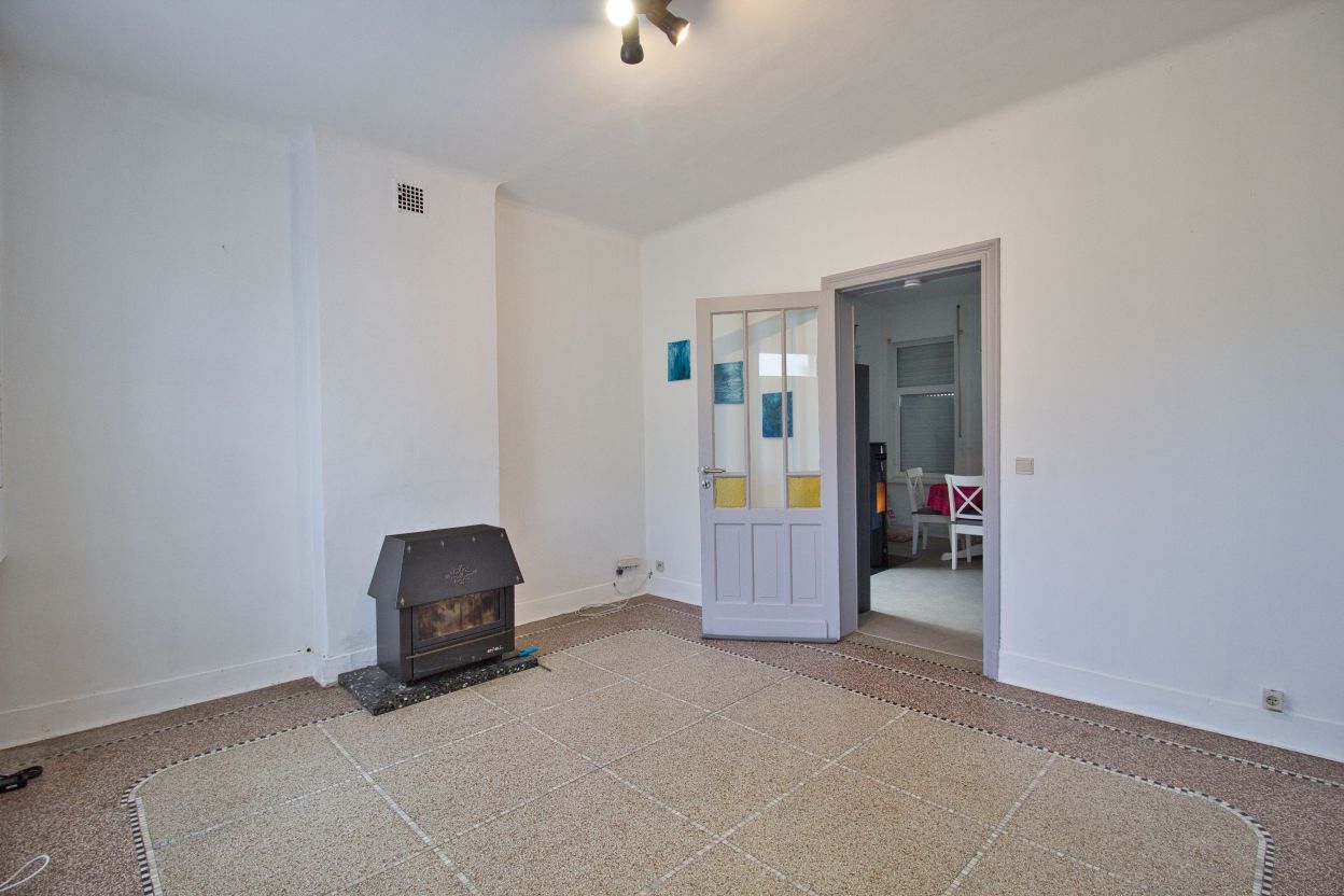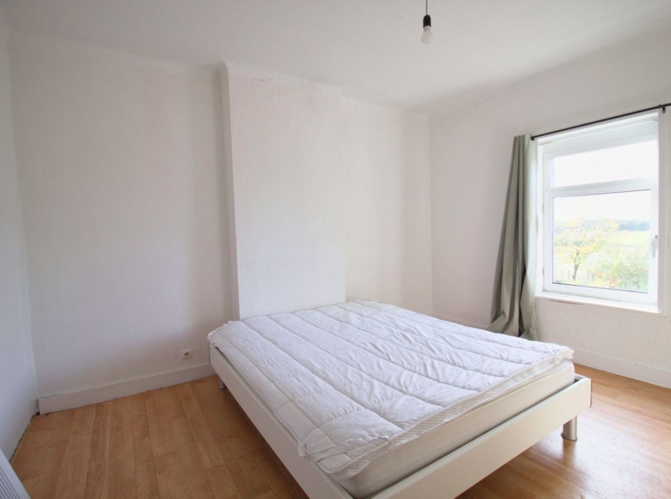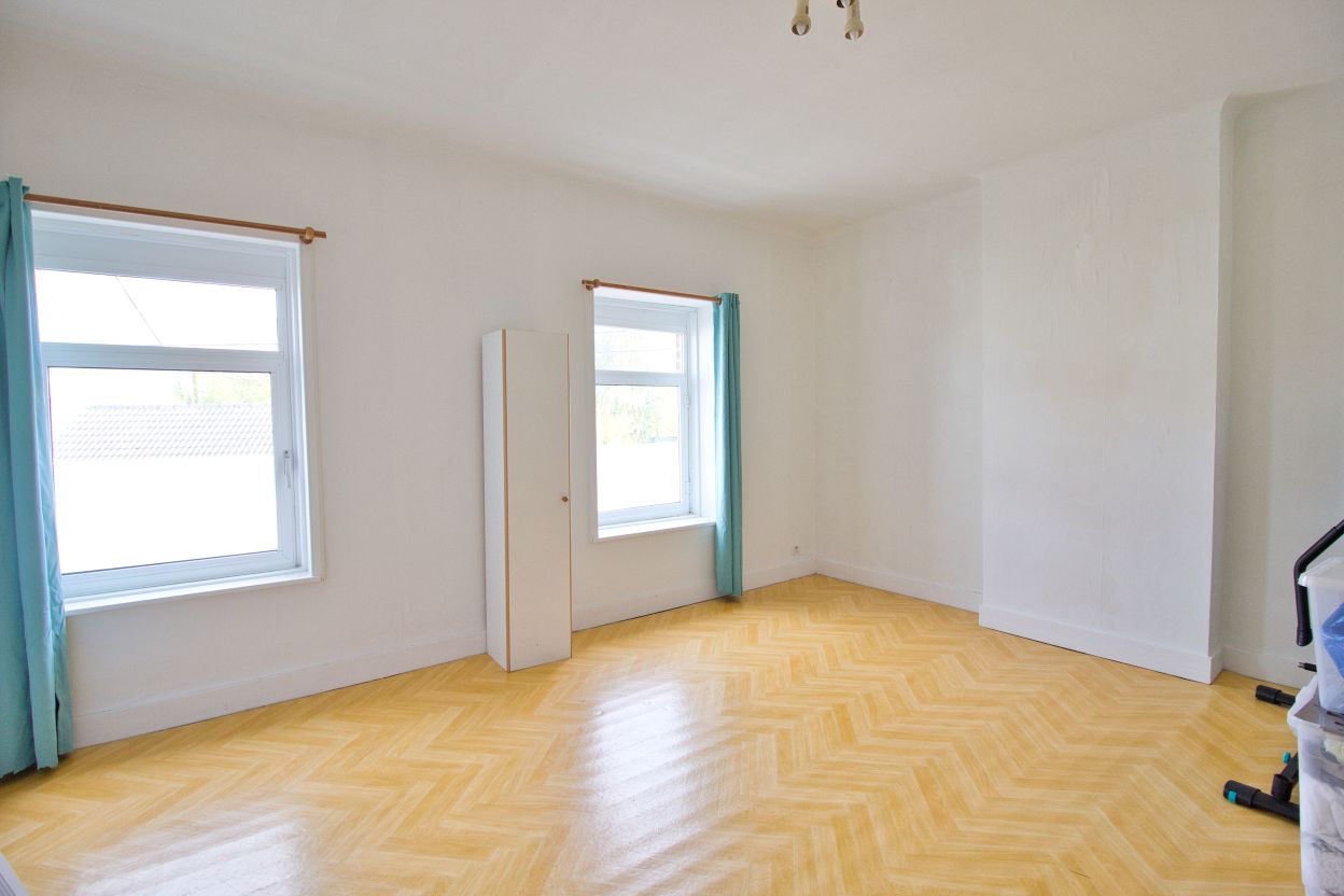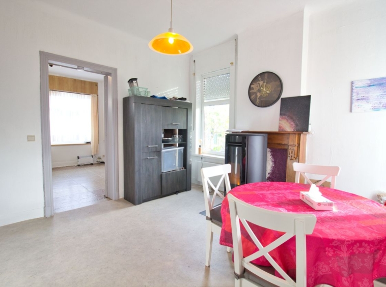 Rez de chaussée: Salon carrelé avec poêle à bois (+/- 18 m²), Salle à manger en vinyle (+/- 15 m²) avec nouveau poêle à pellets cuisine non équipée +/- 9.5 m² (prévoir gazinière et frigo – possibilité de racheter au locataire – voir ci-dessous), salle de bains avec coin machine et WC séparé (+/- 8.5 m²)