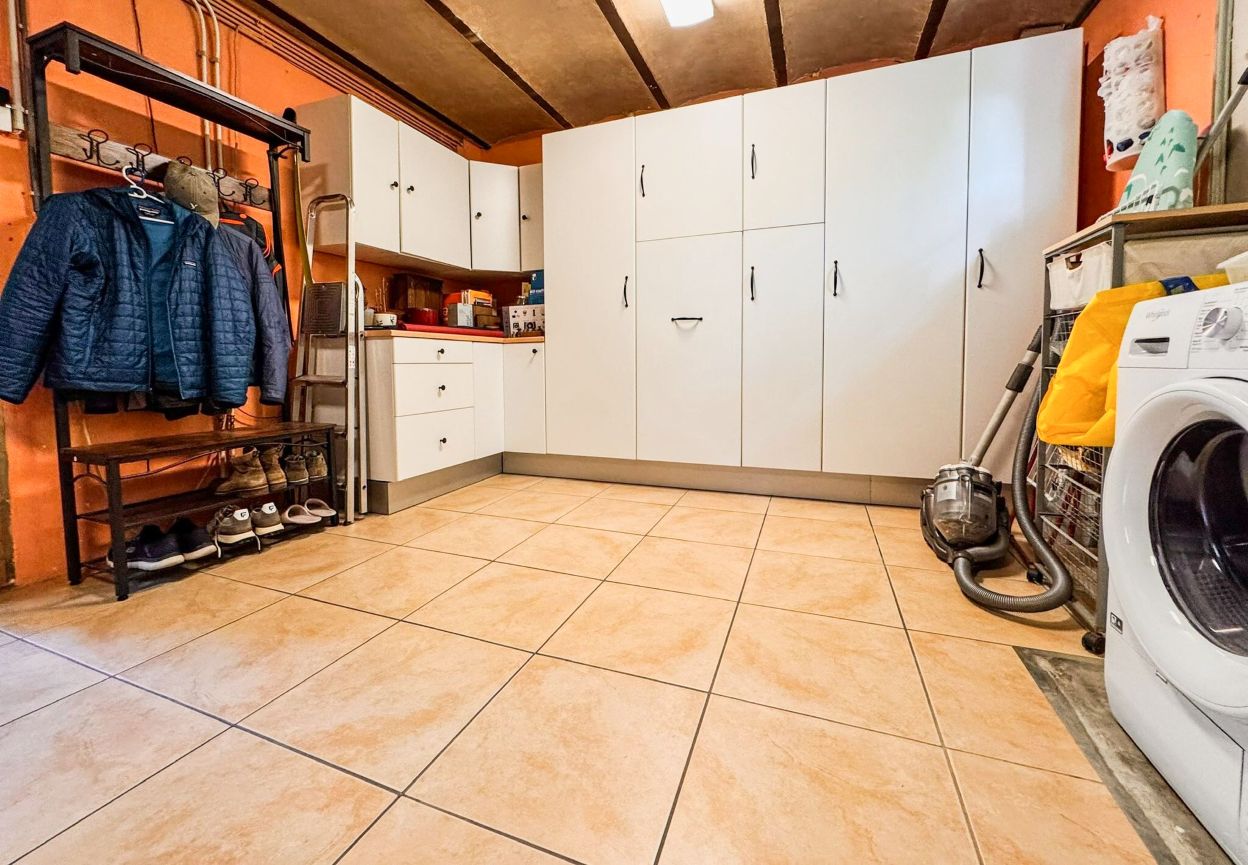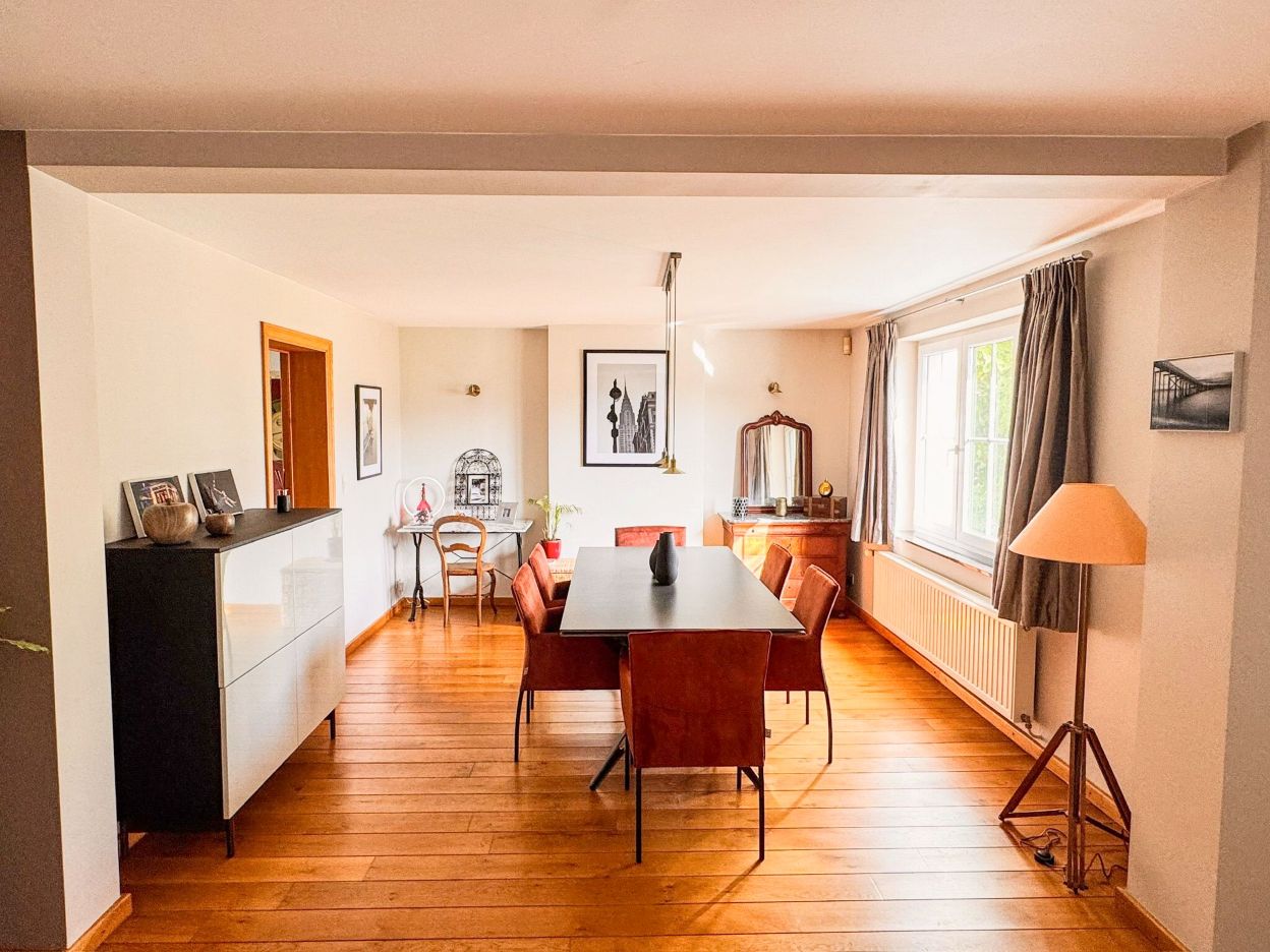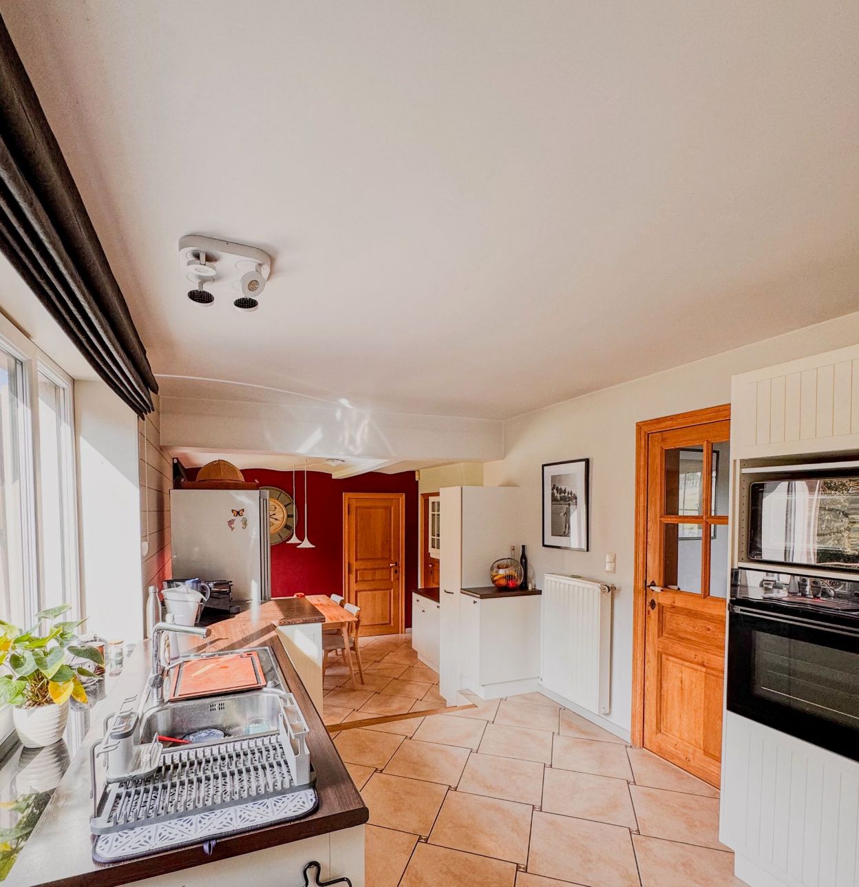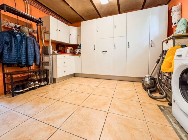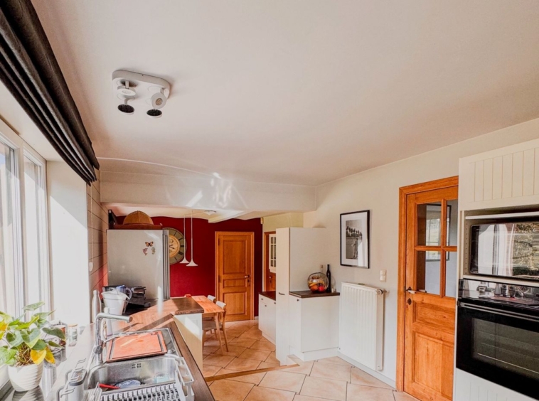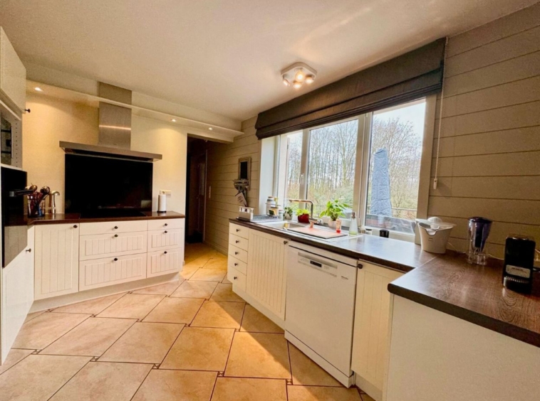 Rez de chaussée: (parquet massif) salon avec insert bois (+/- 29 m²), salle à manger (+/- 23 m²), hall (+/-5 m²) avec WC (+/- 1.5 m²), cuisine hyper équipée avec vaste coin à déjeuner de +/- 20 m², buanderie (+/-19 m²), salle de bains (bain, douche, lavabo) de +/- 7 m².
