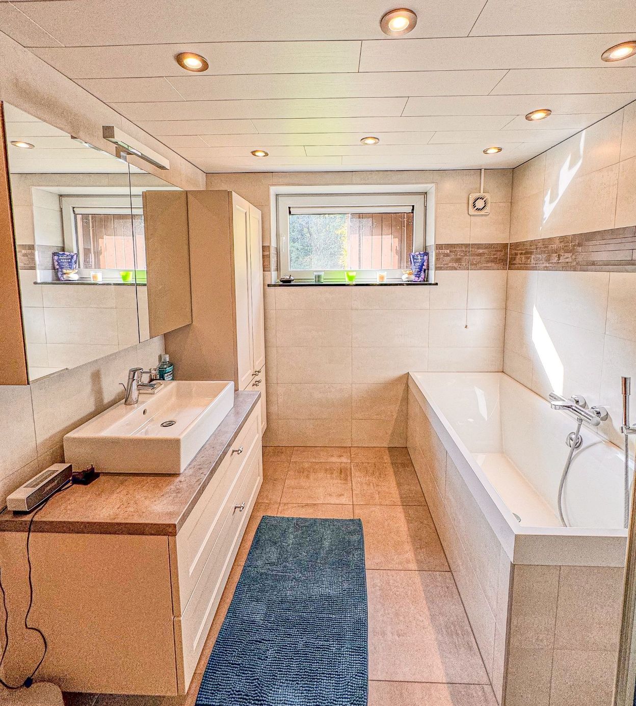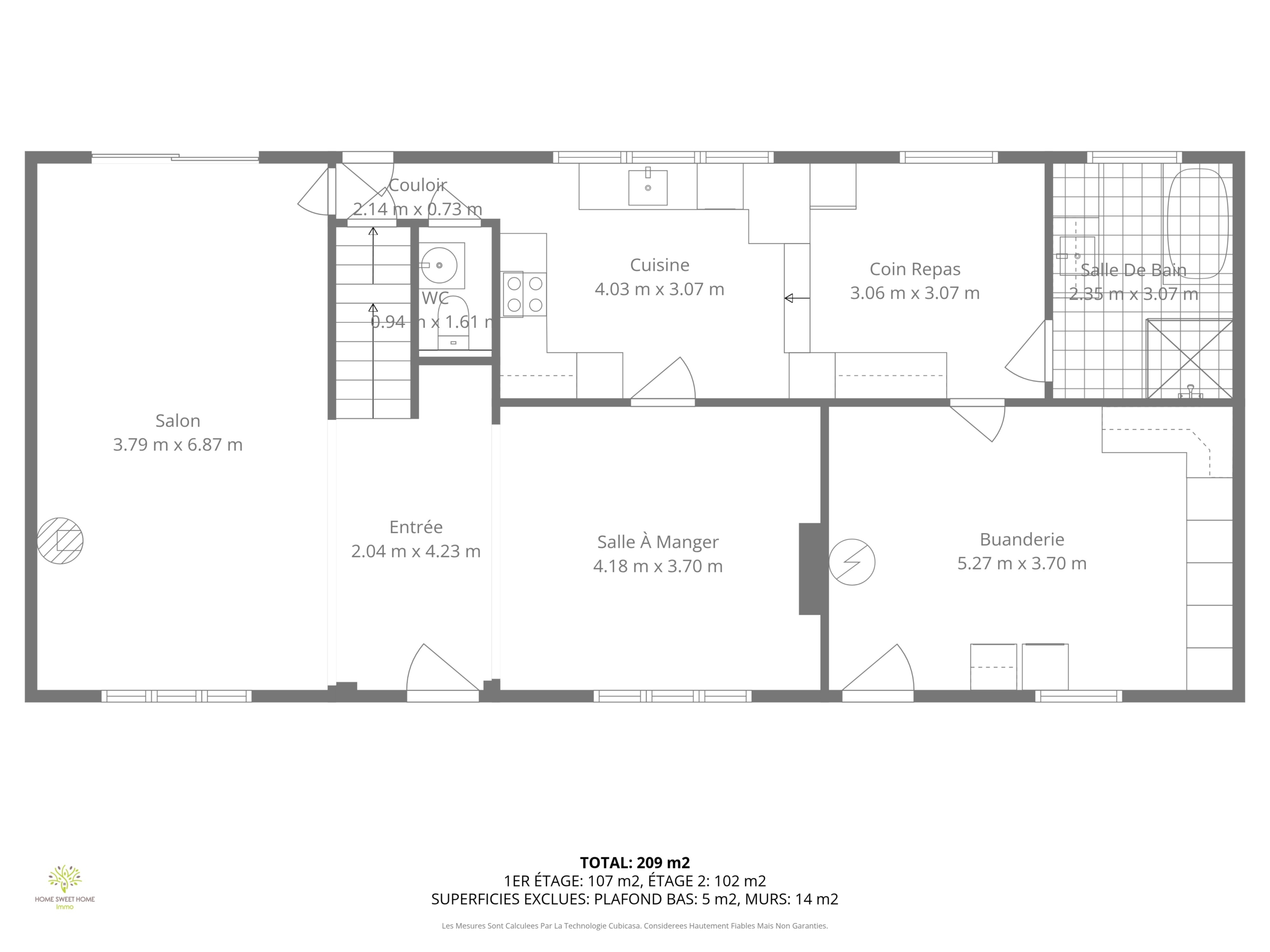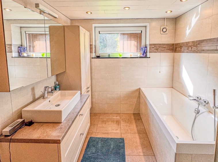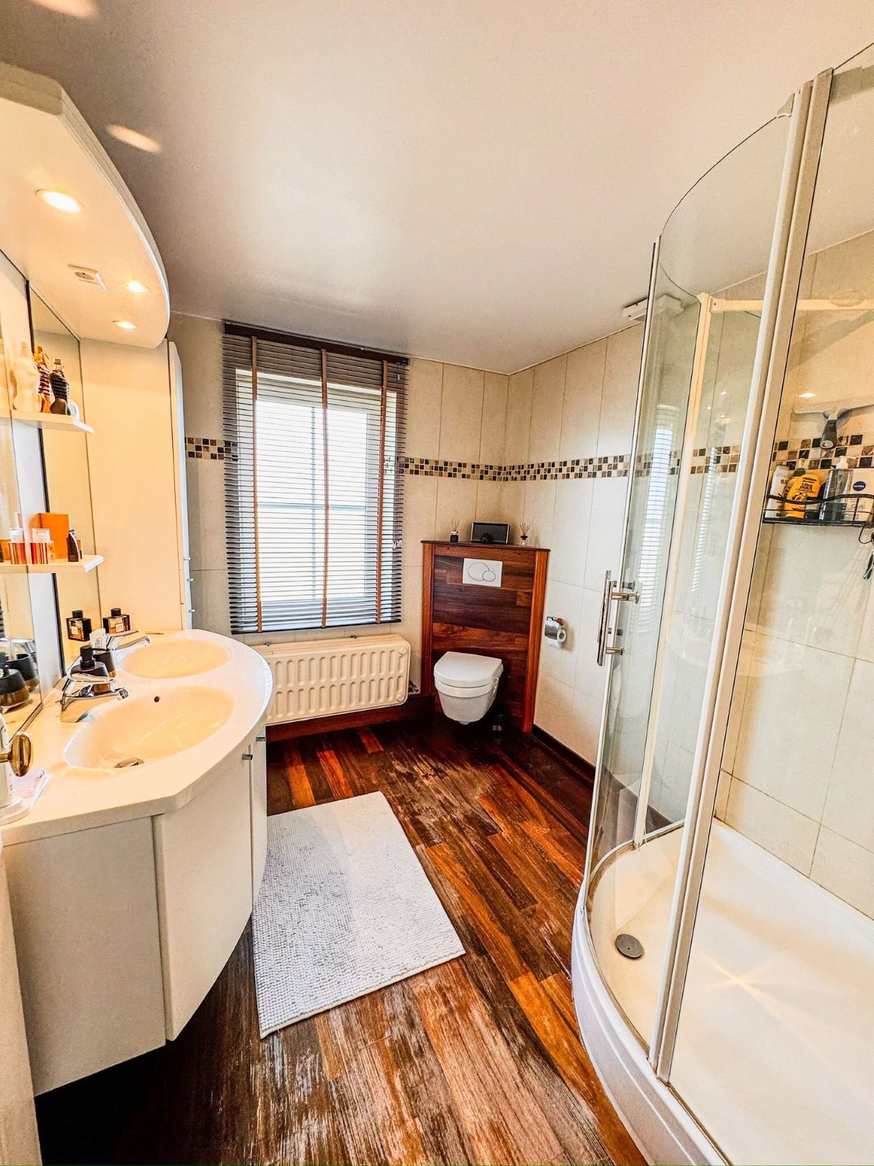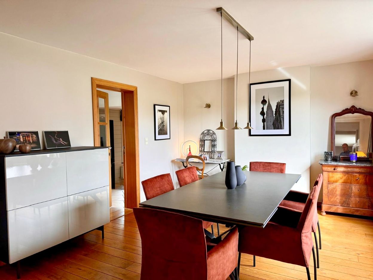 Rez de chaussée: (parquet massif) salon avec insert bois (+/- 29 m²), salle à manger (+/- 23 m²), hall (+/-5 m²) avec WC (+/- 1.5 m²), cuisine hyper équipée avec vaste coin à déjeuner de +/- 20 m², buanderie (+/-19 m²), salle de bains (bain, douche, lavabo) de +/- 7 m².