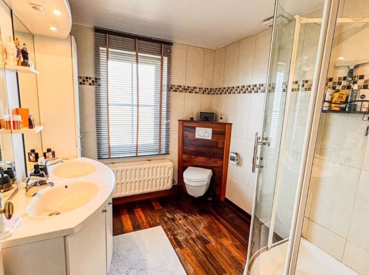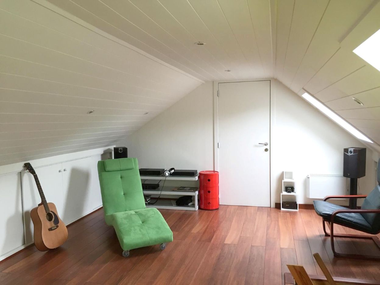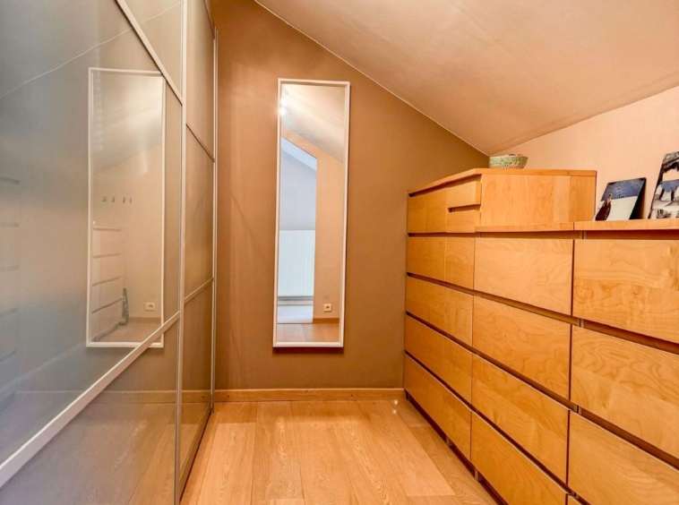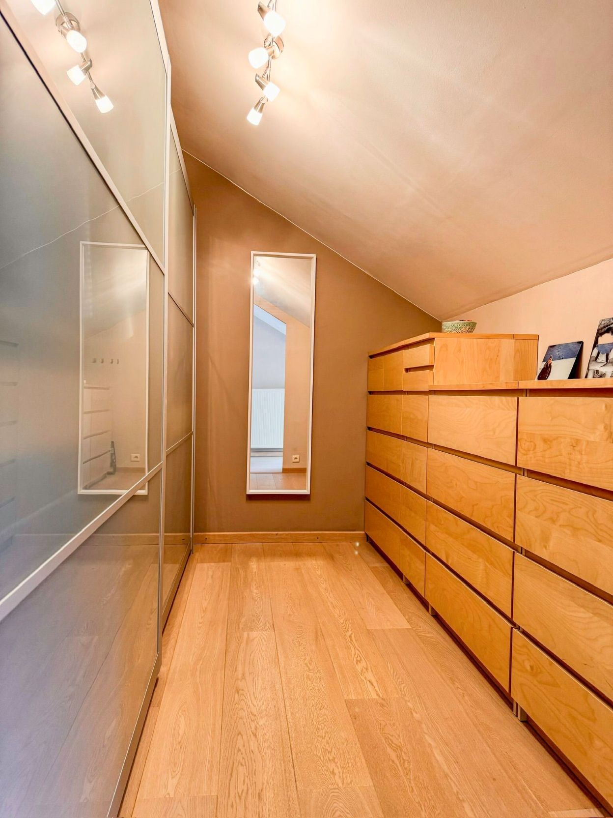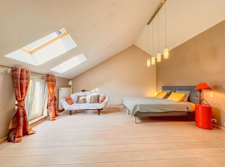 Combles: (plancher en afzelia) Vaste espace “lounge” aménagé de placards (+/- 24 m²) et grenier de rangement (+/- 25 m²)