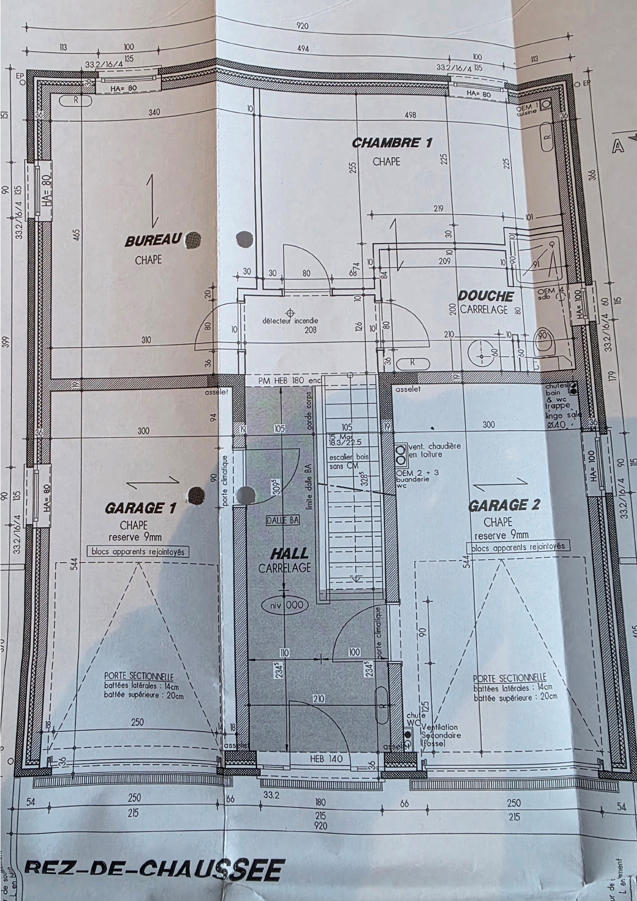 Rez de chaussée : (carrelage et vinyle) Hall (+/ 10.5m²), WC, chambre ou bureau (+/- 15.5 m²), chambre (+/- 13 m²) salle de douches (+/- 4 m²), double garage 2 16.5 m²) avec porte automatique et une borne électrique.