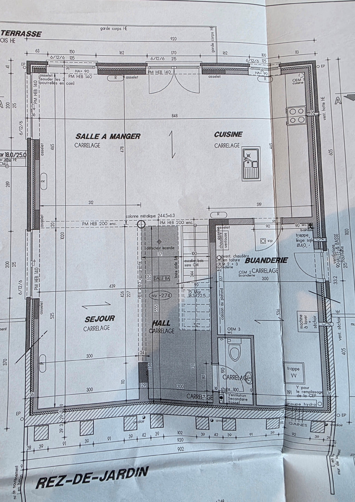 Etage – 1: (rez de jardin):cuisine US hyper équipée avec salle à manger (+/40.5 m²), Salon (+/- 28 m²), WC, Buanderie (+/- 14 m²).