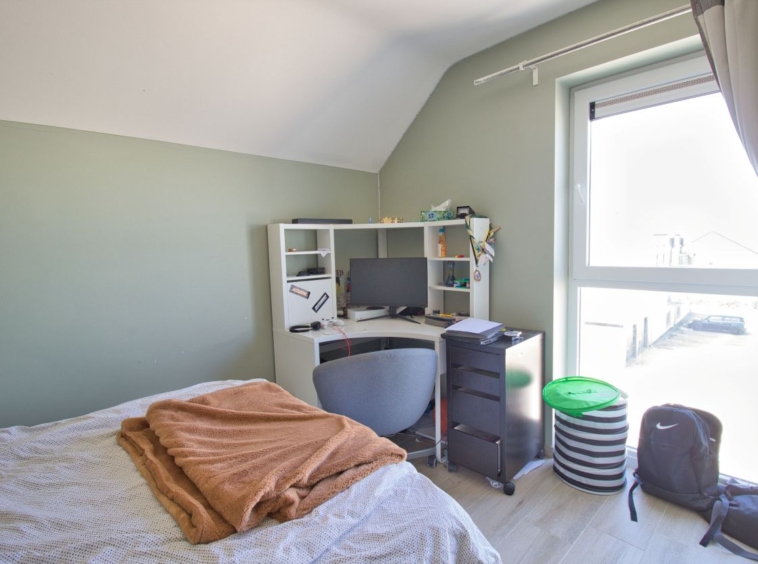 Hall de nuit (+/- 6 m²), 2 chambres carrelées (+/- 14/10m²), une salle de bains (bain, lavabo, coin machine) +/- 4 m², WC (+/-1.5 m²)